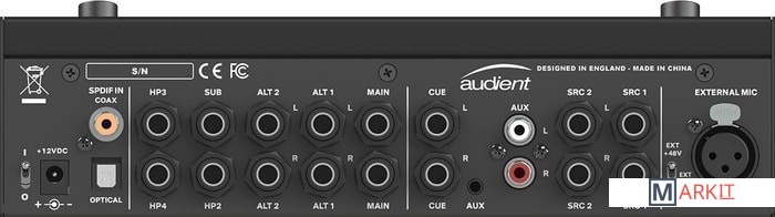 4 аналоговых стерео источника2 входа линейного уровня1 выделенный вход Cue Mix1 x вход Aux (RCA или мини-джек)Оптические и коаксиальные входы S / PDIF3 x стерео выхода на динамики1 х назначаемый вспомогательный выход4 выхода для наушников с гибкой маршрутизациейИнтеллектуальные точки касания для настройки пользователяВход обратной связиВнутренний микрофонВход внешней двусторонней связиРегулировка яркости, обрезки, моно и полярности монитора
